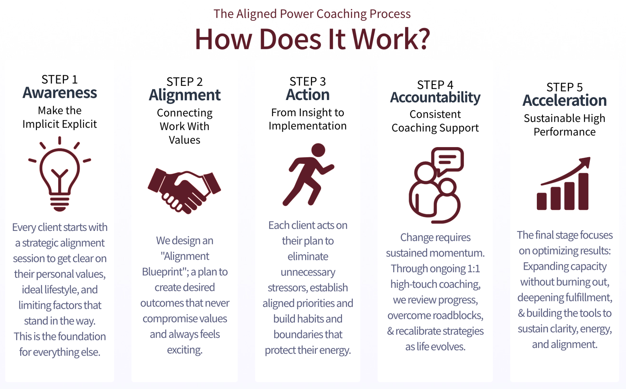 Aligned Power™ is a 6 - 12-month, high-touch coaching partnership designed to transform disengaged or distracted professionals into balanced, energized, purpose-driven performers using their own values and goals as fuel!